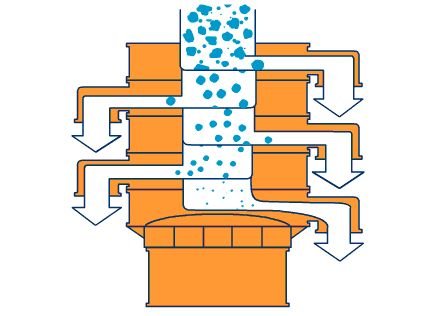 旋轉篩粉機采用YZUL立式振動電機作為激振源,通過振動電機上下兩端的偏心重錘將旋轉運動轉變?yōu)樗、垂直、傾斜的三次元運動,并傳遞到篩粉機的篩面上;物料通過入料口進入設備內,根據不同物料篩分要求,物料經過1-5層采用不同目數的金屬編織篩網的篩分層,在這個過程中,位于各層的篩網下的清網裝置(彈跳球)通過頻率振動不斷撞擊篩網,使篩網上層物料能夠順暢的透網篩分,并有效解決了物料堵網問題出現,不同目數的物料通過各層對應目數的篩網后在各層的出料口排出,實現篩選除雜或過濾分級的目的。調節(jié)上、下兩端的相位角,可以改變物料在篩面上的運動軌跡。