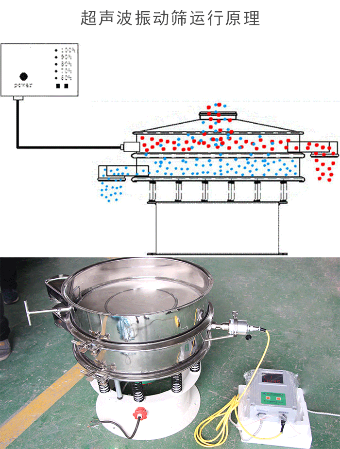 超聲波振動篩是將220v、50HZ或110v、60HZ電能轉(zhuǎn)化為38KHZ的高頻電能,輸入超聲換能器,將其變成38KHZ機械振動,從而達到高效篩分和清網(wǎng)的目的。超微細粉體接受巨大的超聲加速度,使篩面上的物料始終保持懸浮狀態(tài),從而抑制粘附、摩擦、平降、等堵網(wǎng)因素。解決了強吸附性、易團聚、高靜電、高精細、高密度、輕比重等篩分難題,使超細微粉篩分不再難事,特別適合高品質(zhì)、精細粉體的用戶使用