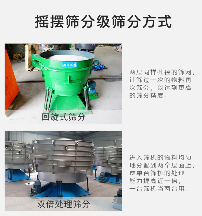 1、回旋式篩分:兩層同樣孔徑的篩網(wǎng),讓篩過(guò)一次的物料再次篩分,以達(dá)到更高的篩分精度。
