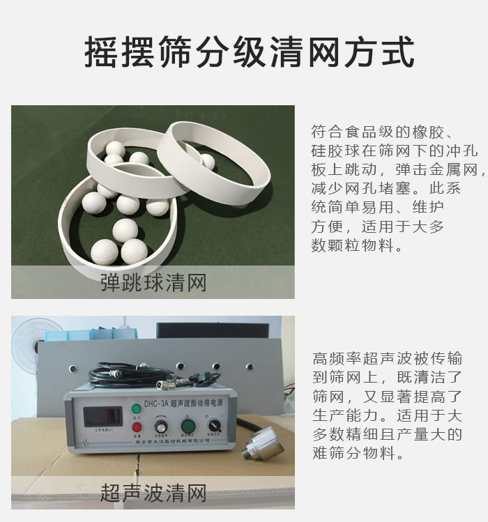 超聲波清潔:高頻率超聲波被傳輸?shù)胶Y網(wǎng)上,既清潔了篩網(wǎng),又顯著提高了生產(chǎn)能力。適用于大多精細(xì)的、大產(chǎn)量的、難篩分的物料。